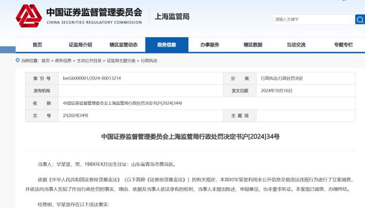 对毕某昱利用未公开信息从事相关证券交易的行为,责令改正,没收违法所得48.51万元,并处以70万元罚款。