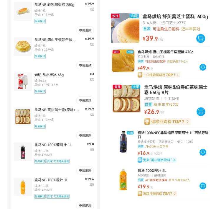 不仅如此,李小姐此前偶然发现,家附近的盒马奥莱也可以配送上门了。“如果说盒马鲜生的东西我还要计划着买,那盒马奥莱的东西就可以看上什么要什么。”最近她下了一单,加上配送上门的3元运费,总共115元,包括3大瓶1升装的果汁、一个榴莲千层蛋糕、一个轻乳酪蛋糕、一盒瑞士卷和几根棒冰。“我算了一下,和盒马鲜生比,部分商品的规格小了点,但总价节省了大约四五十元。再也不用拿着优惠券去选对应品类,或者惦记着优惠券的过期时间了。”