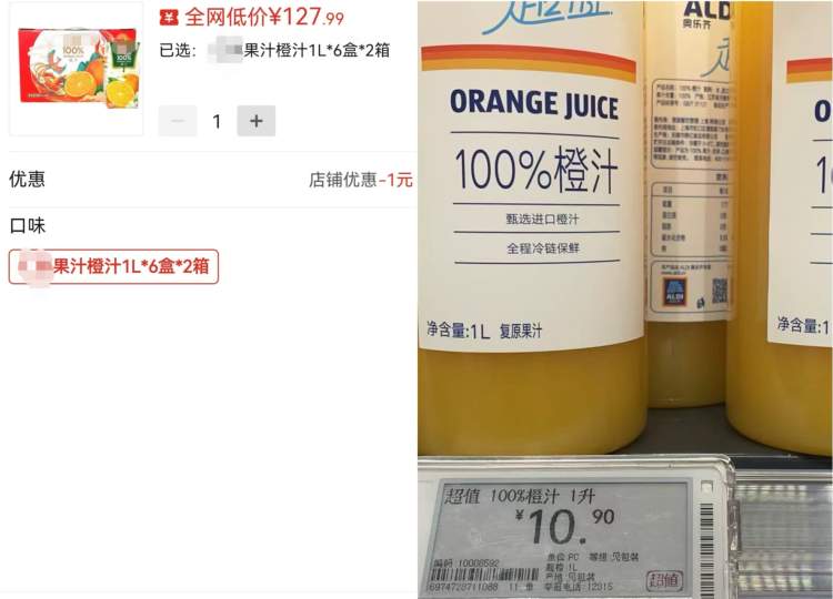 果汁饮料爱好者也能在这里淘便宜。习惯了便利店里300毫升就要10元的橙汁、茶餐厅里二十元一杯的冻柠茶,猛一看到冷柜里1升装只要9.9元的港式冻柠茶、10.9元的100%橙汁,简直有种“天上掉馅饼”的感觉。打开以便宜闻名的电商,输入“100%橙汁一升装”,跳出来的“全网低价”,常温1升装得买两箱共12瓶,才能得到127.99元的价格,平价每瓶得要10.66元,和单独买一瓶奥乐齐冷藏的100%橙汁价格差不多。