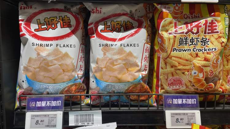 除了社区平价超市,大润发这样的传统卖场也不时会迸发惊喜。市民陈先生最近逛家附近的大润发,看到某品牌的鲜虾片零食礼包仅10元出头,里面有40克6包,感觉十分划算。“我在电商上也搜索过这款零食,40克不到2元的价格很多网店都做不到。”