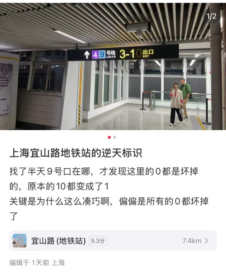 10月24日,有市民发现,在宜山路地铁站的标识牌中,“10号口”中的“0”亮度与其他字符相比较暗,看上去像里面的灯坏掉了一样。可是令他感到奇怪的是,宜山路地铁站的全部标识中,所有且仅有“0”都“坏掉了”。
