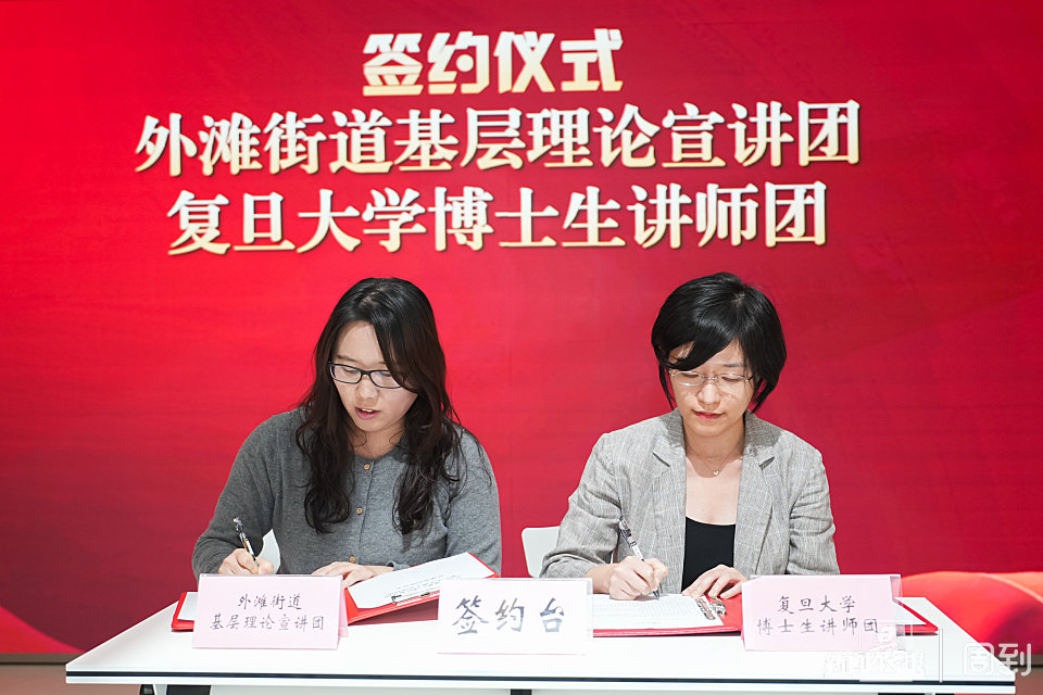 为了更充分地发挥各自在专业领域和基层实践中的独特优势,外滩街道基层理论宣讲团与复旦大学博士生讲师团在活动现场正式签署了联建协议,旨在进一步深化双方在理论宣讲、青年人才培养等方面的紧密合作。复旦大学博士生讲师团也再次通过展播其精心制作的宣讲视频《研读新时代——让开放的春风温暖世界》,积极参与并丰富了宣讲内容。