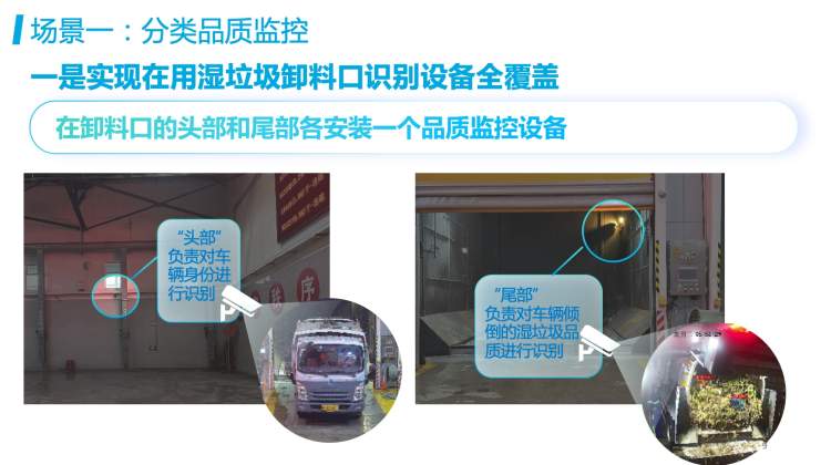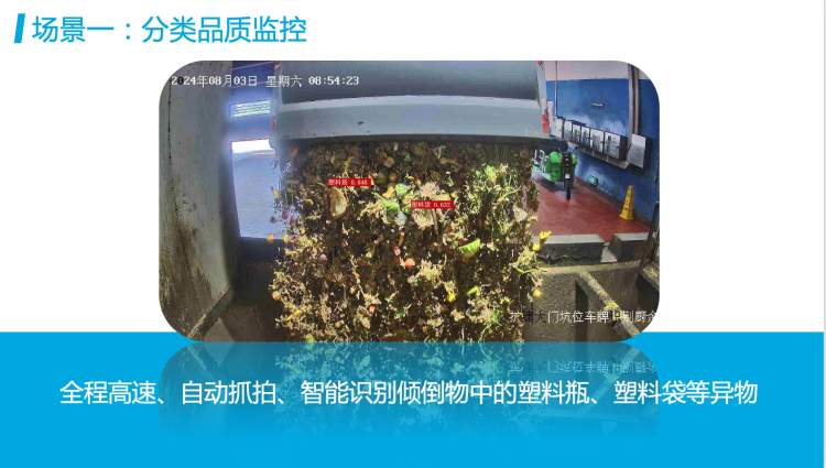 “在‘分类品质监控’场景中,我们借助人工智能手段,通过借助全市湿垃圾转运、处置设施已有的进场称重设备,与卸料口处车辆前部的身份识别设备实时连接,实现全程高速、自动抓拍、智能识别倾倒物中的塑料瓶、塑料袋等异物,继而能够对分类品质未达标的车辆采取车辆溯源机制。”