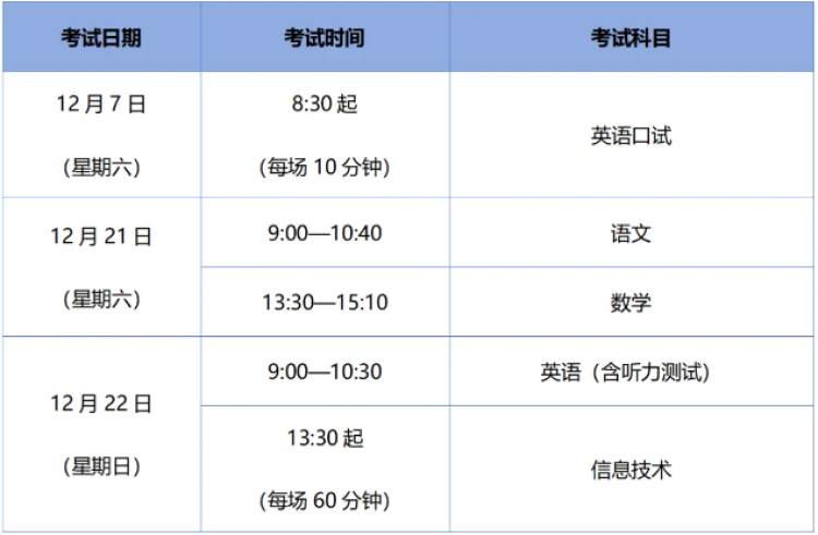 考试科目包括语文、数学、英语和信息技术。语文、数学科目采用笔试方式,时间均为100分钟。