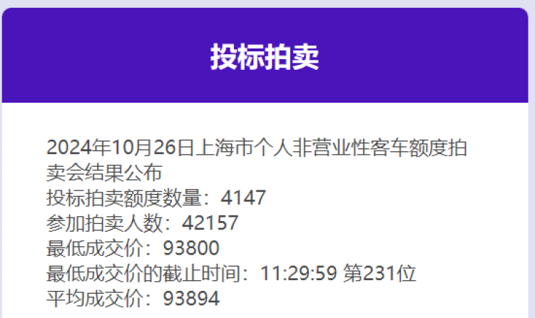 10月沪牌拍卖已经结束,拍牌结果显示:个人额度合计拍卖总数4147个,参加拍卖人数42157人,中标率9.8%。