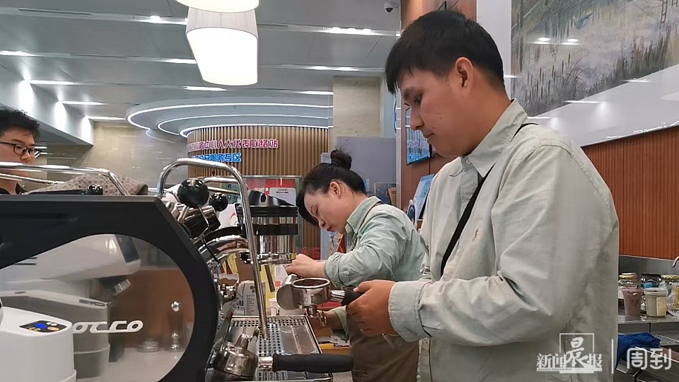 店长肖小燕和天天(化名)两人,忙得不亦乐乎。天天一丝不苟地配合着肖小燕,制作好一杯杯醇香的咖啡,送到客人手上。