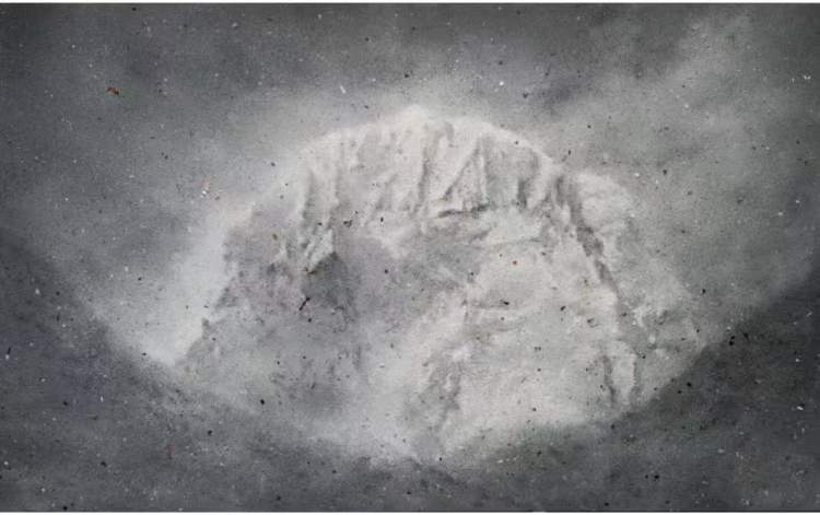 第二个板块是“地”,表现大地和草木。其中一件巨作是张洹的《冈波仁齐10号》,艺术家用香灰作画,香灰代表了信仰,堆积而成一座圣山。艺术家展望的雕塑《假山》,犹如一块外星飞来的陨石,矗立在外滩边上的久事美术馆。