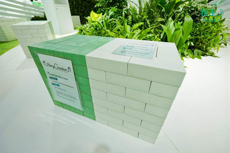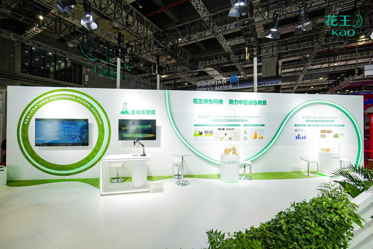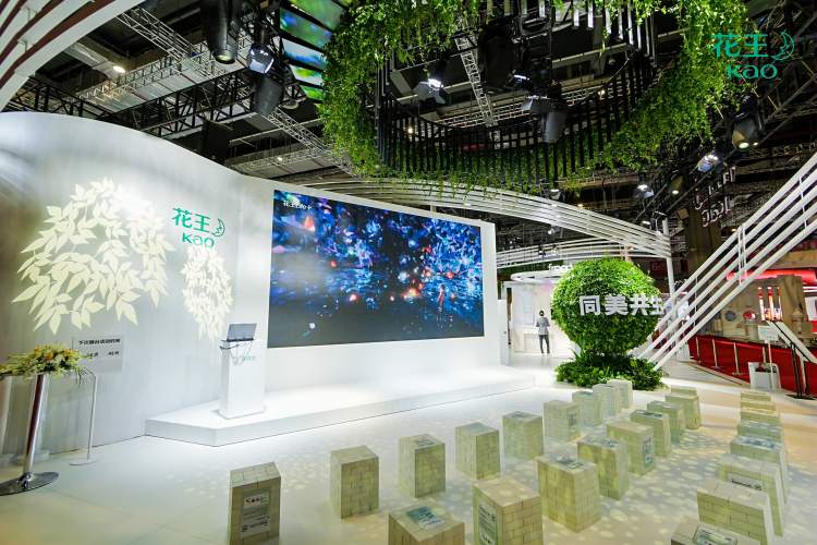在循环利用创新方面,针对难以循环利用的补充装包装,花王利用独有的技术将其回收并赋予全新价值,成功转化为再生塑料积木或是新的补充装包装。在花王展馆中,主舞台和花王Life+展区的坐凳、展示台、文件托盘等,都是由这些再生塑料积木打造而成,现场观众被这一创意吸引争相触摸体验。
