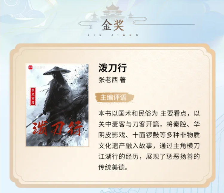 阅文集团内容运营部总经理杨沾也表示,目前很多网文小说会有意识把非遗元素融入故事,让读者产生兴趣,有所拓展,“比如这次获奖的《泼刀行》,并不是非要把非遗技法做‘一二三四五’的拆解,而是直接融入非常浓厚的西北文化氛围,这样读起来反而更鲜活。”