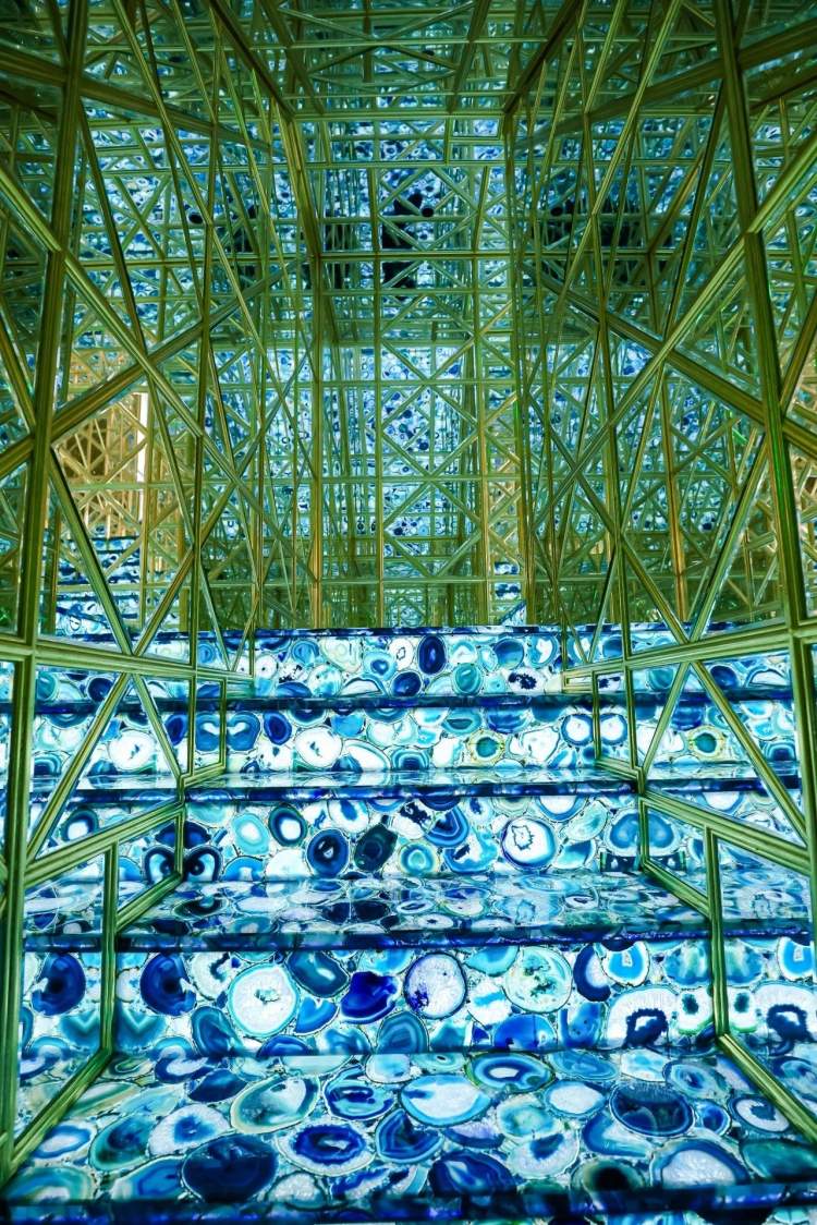 蓝色天然玛瑙与金色镜面交相辉映,营造出一种超越现实的时空错乱感,凸显、感知世界的多彩。在这个貌似矛盾,实则和谐的张力场中,每一个过客都被柔软地包裹其中,在明暗交错间找寻灵魂的驿站。