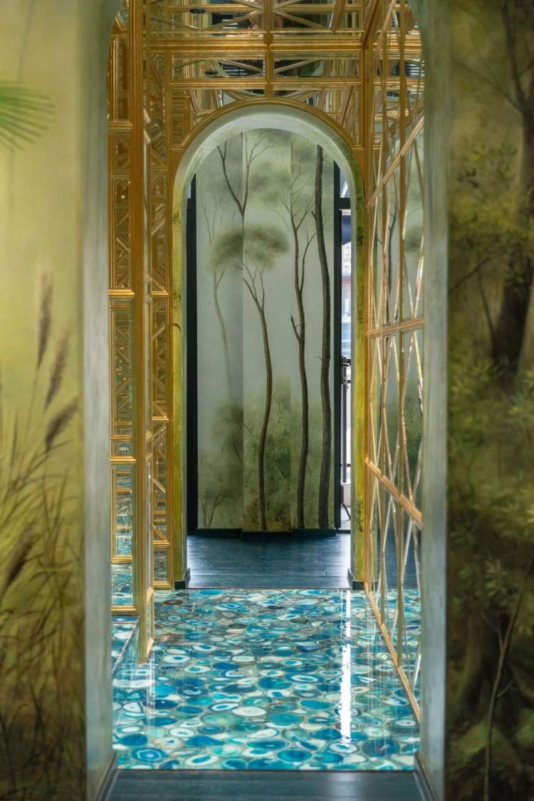 会馆内的“万花筒”楼梯堪称郭培的用心之作。金色轮廓的几何镜面巧妙排列于楼梯墙面,光影交错,一个绚丽夺目的多维空间跃然眼前。蓝色天然玛瑙拼接的地砖与金色镜面交相辉映,行走其间,仿佛置身于梦幻般的艺术殿堂,令人目不暇接。这里不仅是会馆的最大亮点,更是打卡留影的绝佳之地。