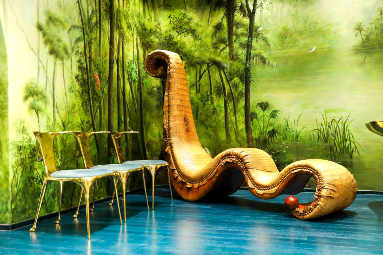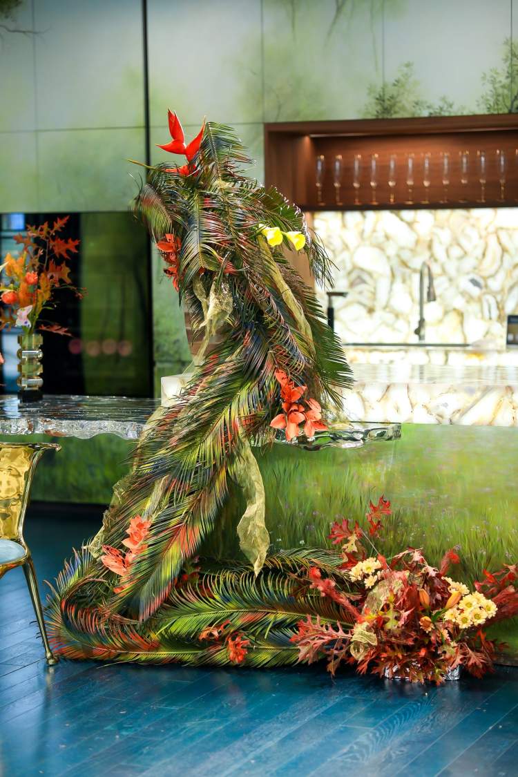 拾级而上,步入高定会馆的二楼, 仿佛跨入了这位高定女王构筑的秘境之域,映入眼帘的是一片葱郁繁茂的热带雨林:高大的乔木参天而立,藤蔓缠绕,飞鸟啁啾,一只金钗豹在草丛中潜伏,狩猎的前一刻凝神屏息。这栩栩如生的热带雨林全景壁画,出自知名写实派手绘画家之手,以极富空间感的绘画技法和对自然生态的考究,将二楼空间打造成了一方隐秘幽深的童话森林。