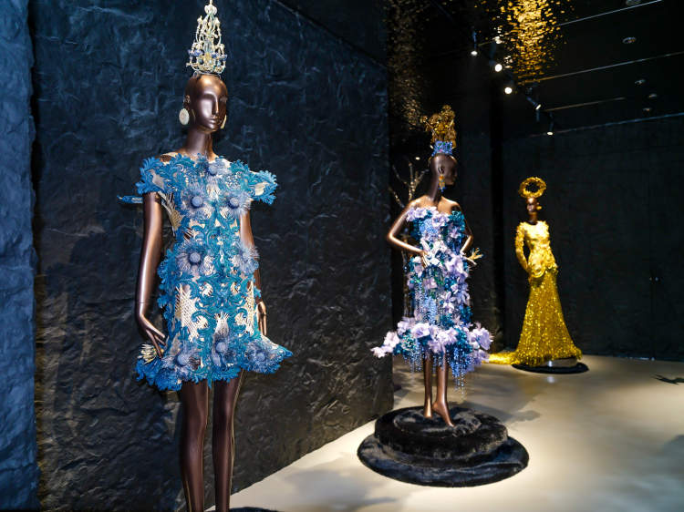 在一楼,郭培的“极乐岛”巴黎高定大秀款系列,也在除巴黎、洛杉矶外第三次全世界范围内公开亮相,通过预约,来宾便能不出国近距离观赏到凝聚了千万个工时的高定巨作的魅力。