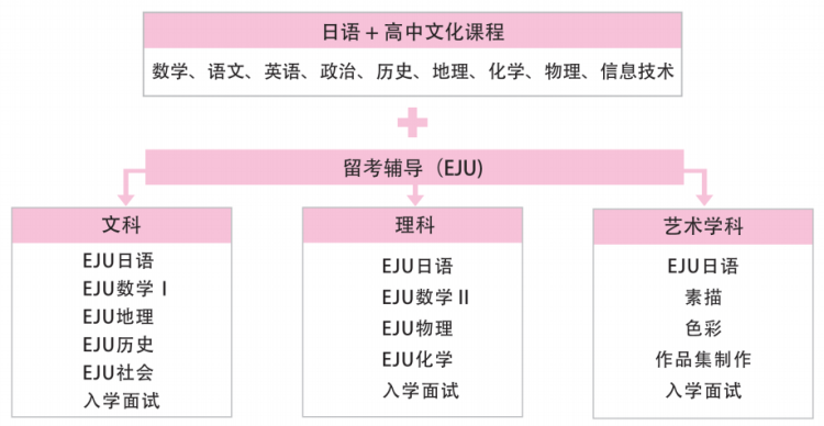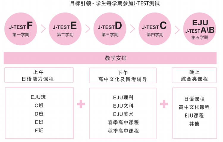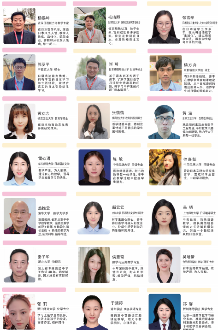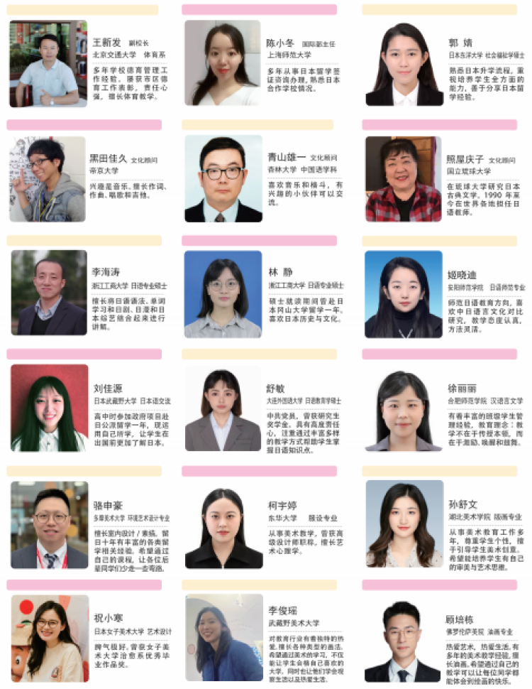 由经验丰富的高中学科老师+日语教师+日本留学指导教师组成,提供学习指导+生活指导+升学指导。