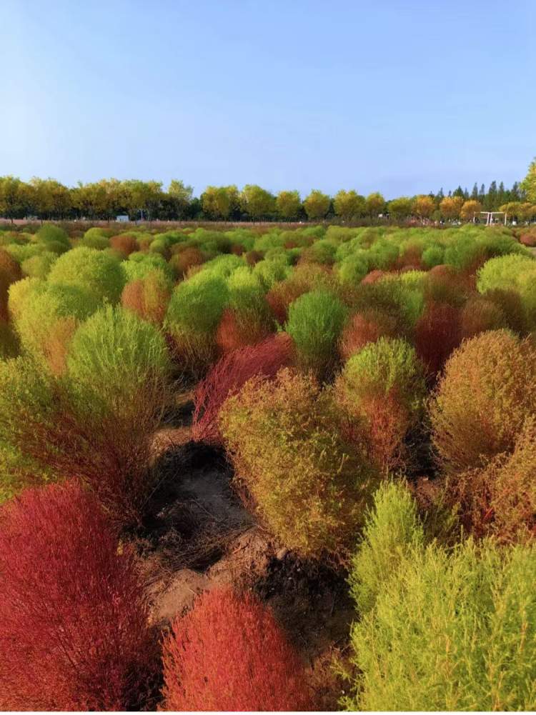 从市民游客拍摄的照片来看,金山花开海上生态园的地肤真的十分壮观,前几天还是红绿对半的状态,这几天已经大面积变色,一簇簇毛茸茸、圆滚滚的球,看起来真的太萌了。这里有整整60万株地肤。从社交平台的留言来看,还有香港花友不远千里飞来打卡。