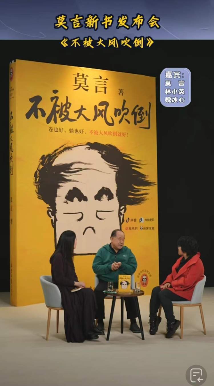 当晚还举行了新书首发直播活动,在直播间,莫言和北大教授林小英、凤凰网读书主编魏冰心畅聊自己不被大风吹倒的故事,以及他感悟到的生活态度和人生智慧。