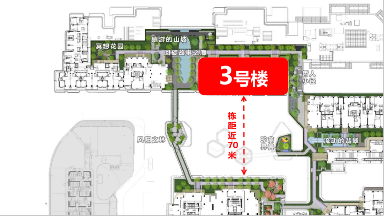 除南向约4500平的中央景观之外,西侧紧邻核心水景花园,东侧紧邻哲人小径,风归之林和珍禽异兽两个核心景观组团也分别位于两侧。