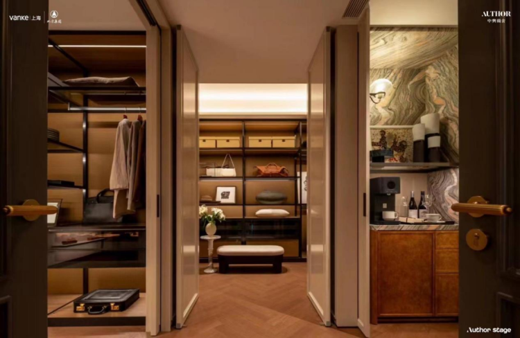 超级收纳体系,通过精心设计的收纳体系,包括玄关行李间、独立家政间、客厅收纳柜、主卧男女衣帽间等。