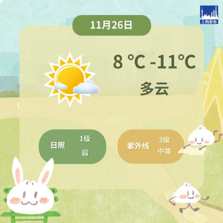 上海今天多云,降温明显,全天气温在8℃-11℃之间,早间出门气温还有10℃,晚归则仅有7℃-8℃。今天上海吹6级西北风阵风7-8级,沿江沿海地区7级阵风8-9级,在“风寒效应”加持下,体感会很冷。