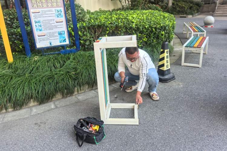 “19号楼门口有一把彩虹椅有点摇晃。”“好的,收到。我正好在家,现在就去修。”回好信息,南翔镇劳动街社区的居民倪金涛带上维修工具立刻出门,直奔19号楼。不一会儿,他就将那把摇晃的公共座椅重新整修好后再安装牢固。