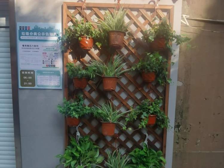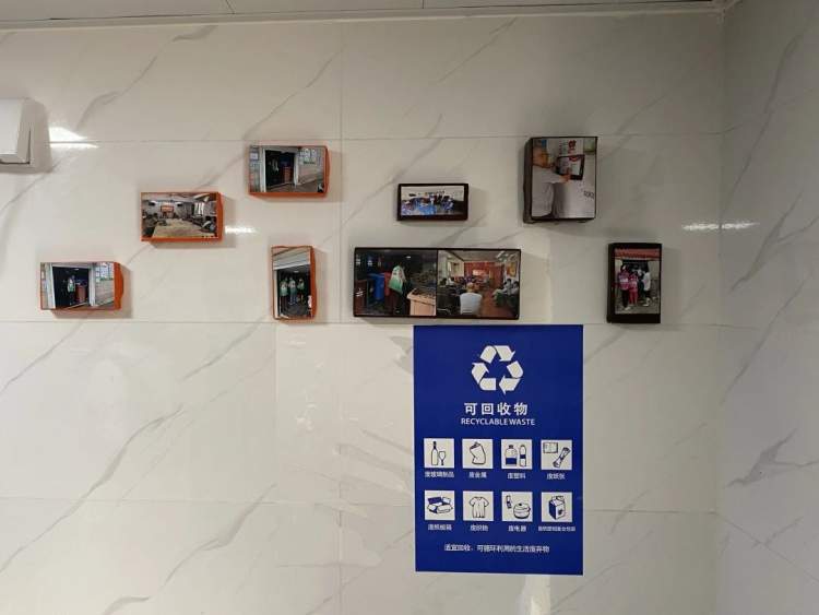 街道减量办还巧妙利用创意墙面进行宣传,通过拍摄居民区垃圾分类讨论会、志愿者活动以及物业保洁员的垃圾分类工作等场景,制作成照片墙,创新性地使用废弃药盒和花盆托盘作为基架,既展示了社区垃圾分类工作的成果,又体现了资源循环利用的环保理念。此外,精品厢房内还配备了太阳能灯、绿植墙、除臭机等节能环保设施,进一步强化了垃圾厢房的低碳环保宣传效应。