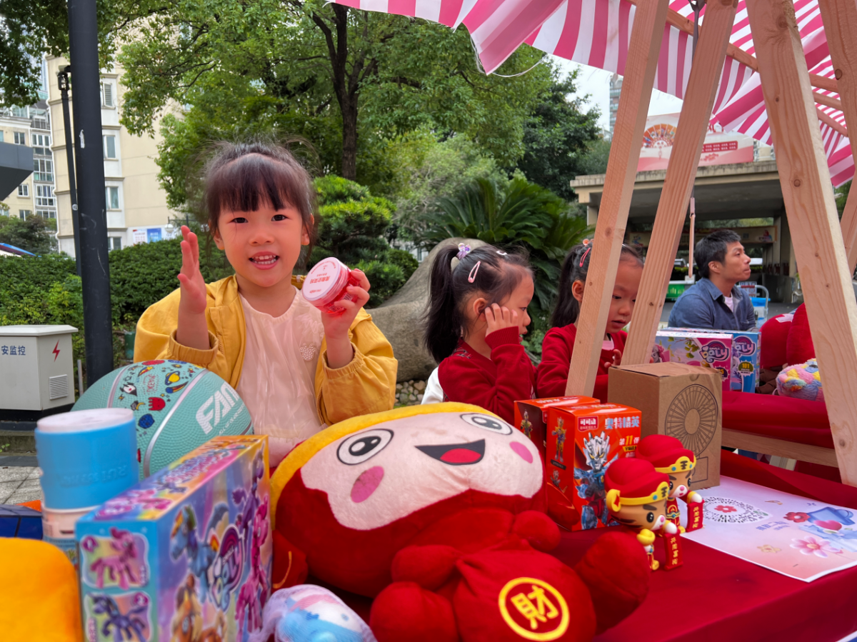 市集上,稚嫩却满怀热忱的小小爱心摊主们,纷纷亮出了他们珍藏的宝贝:有软糯可爱的娃娃、精致的小汽车模型、珍藏的小卡片,以及自己平日里喜爱的文具和自行车等,每一件物品都承载着他们纯真的善意。