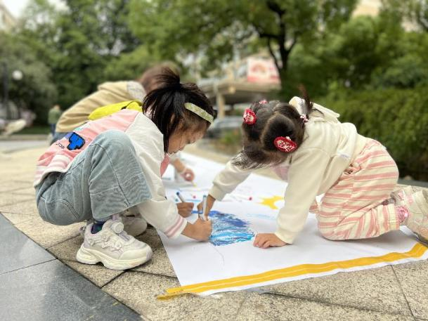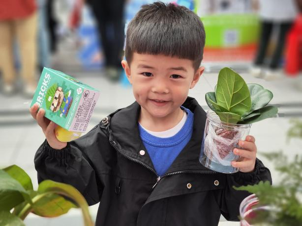 除了热闹好玩的义卖活动,市集现场还有各类别开生面的公益主题活动。巨幅长卷上,孩子们用五彩斑斓的画笔描绘出心中的美好家园,每一抹色彩都代表着对地球的热爱与守护;在保护动物主题的场地上,小朋友兴奋地投掷着圈圈,通过游戏在心中种下了尊重生命的种子;在浇个“盆”友现场,社区家人们拿着与植物相关的物品交换绿植,或者通过捐赠爱心款获得绿植,在传递爱心的同时,为家园增添一抹绿意……这些简单却富有意义的游戏,不仅增进了亲子之间的情感交流,也在轻松愉快的氛围中,传递了积极向上的公益理念。
