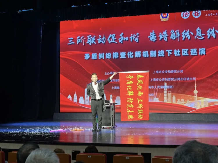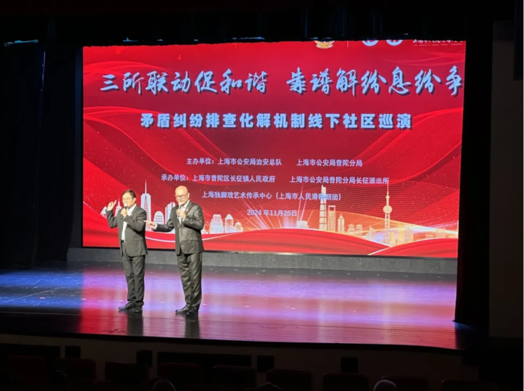 11月25日下午,由上海市公安局治安总队、上海市公安局普陀分局、长征镇人民政府、长征派出所联合主办,上海独脚戏艺术传承中心(上海市人民滑稽剧团)承办的“三所联动促和谐 靠谱解纷息纷争”——矛盾纠纷排查化解机制线下社区巡演在长征社区文化活动中心剧场开演。