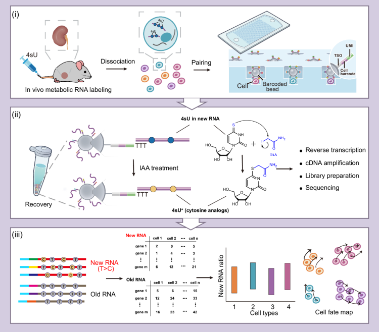 RNA是基因表达的直接产物,其动态变化对于细胞适应环境刺激具有重要意义。然而,传统的单细胞RNA测序技术仅能捕捉基因表达的静态快照,无法解析其动态变化。为解决这一难题,研究团队开发了Dyna-vivo-seq方法,将代谢标记物4sU注射至实验小鼠,通过RNA序列碱基变换实现新旧RNA的区分,从而在单细胞水平上精确分析转录组的动态变化。这一技术突破性地实现了对活体RNA动态的高分辨率观测。