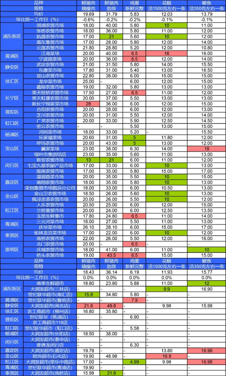 ■粉底标注代表该肉蛋鱼品种在上述农贸市场或超市的最高价;绿底标注代表该肉蛋鱼品种在上述农贸市场或超市的最低价。