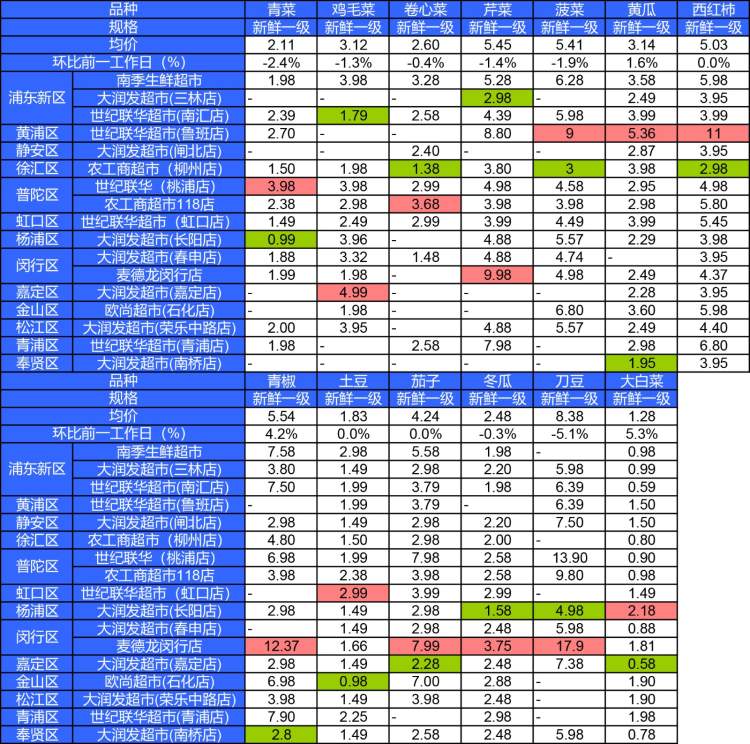 ■粉底标注代表该蔬菜品种在上述农贸市场或超市的最高价;绿底标注代表该蔬菜品种在上述农贸市场或超市的最低价。