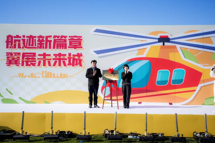 临港服务公司党委书记、总经理冯佳庆与临港新片区管委会商业和文体旅游处处长何晓英共同为“临港新片区低空文旅飞行滴水湖(北岛)起降点”揭牌。