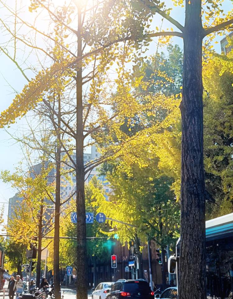 漫步在局门路的街头,仿佛踏入了一幅流动的画卷。抬眼望去,银杏叶如同调色盘上的色彩,斑驳陆离,各自绽放着不同的风采。有的树叶已经换上了金黄色的华服,透亮而璀璨;有的则仍保留着青绿,固执地坚守着最后一抹生机。即便是同一段路程,由于地理位置的微妙差异、树木自身的生长条件,以及气候变化,使得紧邻的三棵银杏树也展现出了“金→黄→绿”的过渡,仿佛是大自然精心布置的色阶展示。