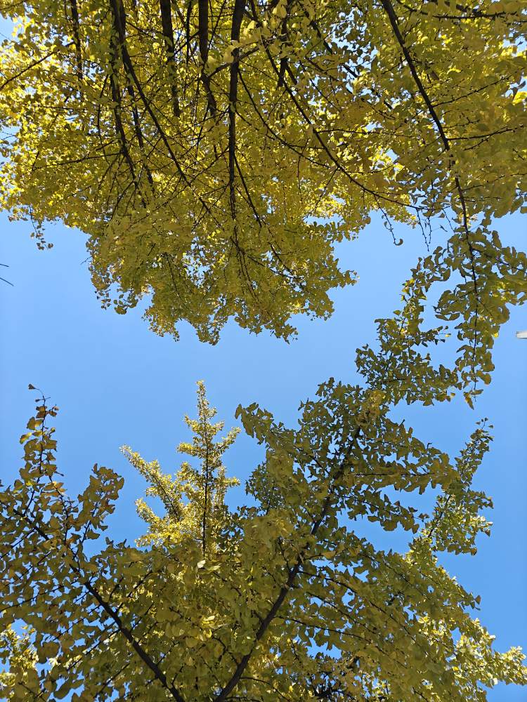 试想,当你手捧一杯热茶,坐在银杏树下品茗,微风略过发梢,金黄的银杏叶飘洒一地,深秋的氛围感这不就来了吗!抬头仰望,在天空的映衬下,片片黄叶点缀枝干上,它们或随风摇曳,或静静悬挂,都在以自己的方式诉说着秋天的故事。