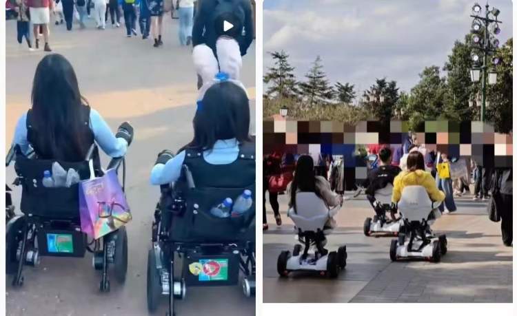 让人感到气愤的是,租赁和乘坐这些电动轮椅的大部分都是腿脚灵便的正常游客,其中尤以年轻人居多。在社交平台,还有年轻人“炫耀“乘坐电动轮椅轻松逛乐园的经历。