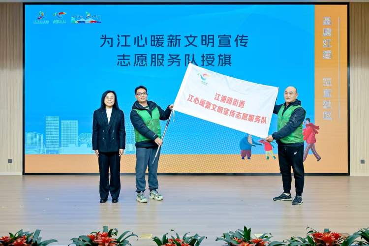 在“锋·尚 ”心语庆典中,江心暖新文明宣传志愿服务队获得授旗。此外,金上海、又一村、吴家浜、大连路、姚家桥5个居民区获评2024年度江浦路街道新时代文明实践&志愿服务示范站点,2024年度江浦路街道“锋·尚”志愿者代表也拿到了荣誉证书。