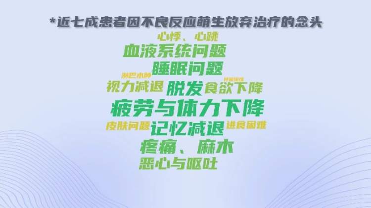 在本次调查的晚期三阴性乳腺癌患者群体中,化疗仍占据主导地位。治疗过程中常见的不良反应,如恶心、呕吐、脱发、疲劳等,不仅严重影响患者的生存质量,还成为影响治疗依从性的重要因素,近七成患者因不良反应萌生放弃治疗的念头。