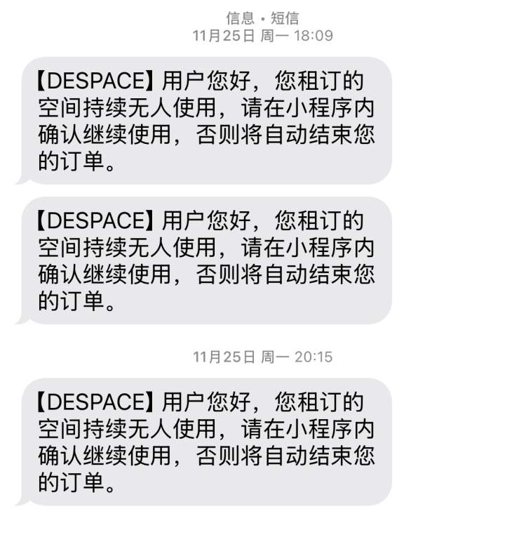 按下门上的按钮,即可离开可以隔音舱。如果没有停止订单,大约每30分钟左右会收到短信提醒,租订的空间持续无人使用,如果不在小程序内确认继续使用的话,将自动结束订单。
