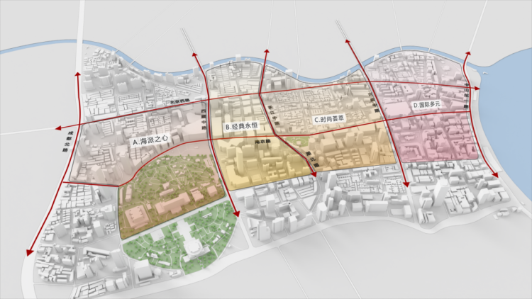 为深入落实《上海市城市总体规划(2017—2035年)》《上海市商业空间布局专项规划(2022—2035年)》和黄浦区空间布局“十四五”规划等总体要求,南京路步行街区功能规划概要近日发布。本轮规划以“繁荣繁华”为总体定位,提出“传承经典·引领未来”的总体愿景,持续推进建设世界一流南京路。结合世界一流商圈发展趋势,规划形成“多元万象”“海派引领”“人人向往”三大规划理念。从区域交通组织、现状商业基础等因素考量,以南北向主干道西藏中路、浙江中路—湖北路、河南中路为界,南京路步行街区形成四大功能分区,从西至东依次为海派之心、经典永恒、时尚荟萃、国际多元。为使四大功能分区有机融合,形成潮趣秀场、城市聚场和全球展台三大转承场景。