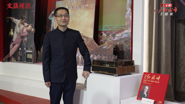 展览现场的《红旗颂》黑胶唱片里,有8个版本的《红旗颂》。1965年《红旗颂》在“上海之春”首演至今,即将迎来一甲子。59年间,著名作曲家吕其明一直在不断地提升和修改《红旗颂》,根据新时代的要求和不同审美群体的需求,吕老创作了12个版本。大家只要听到《红旗颂》的熟悉旋律,马上就会驻足,侧耳倾听,因为这是从我们每个老百姓、每个中国人内心流淌出来的主旋律。