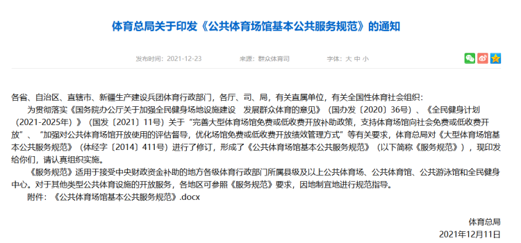 记者从国家体育总局官网了解到,2021年12月,体育总局印发《公共体育场馆基本公共服务规范》,进一步强调体育场馆“免费、低收费开放”,对场馆开放、服务内容等提出一系列细化、量化要求。
