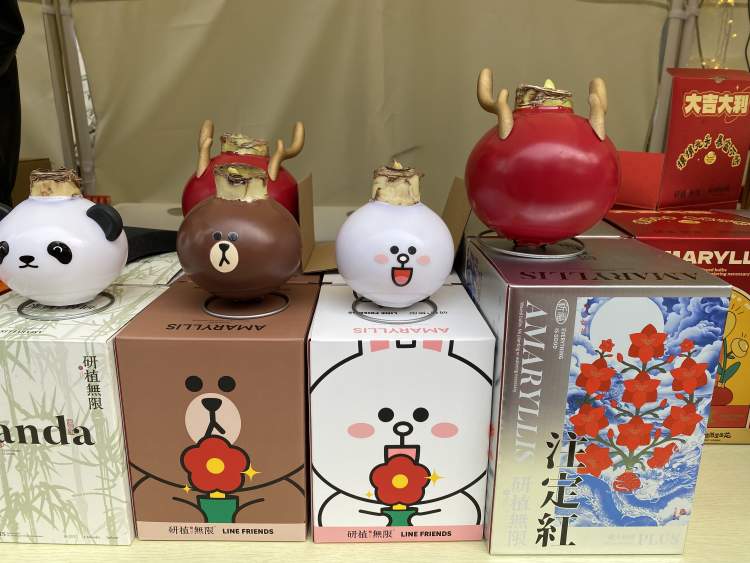 朱顶红因为有“注定红”的好口彩而成为备受市民喜爱的年宵花之一。在虹桥花市的迎新生活节摊位上,记者发现了今年朱顶红的新“颜值”:有的是小熊脸,有的长着龙角,摊主还告诉记者,有一款青花瓷图案的封蜡也是今年设计的新品,不过今天暂时没有带来现场。