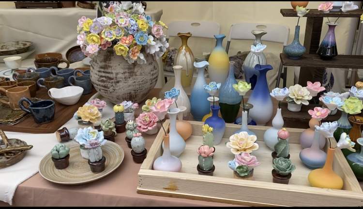 逛花市不仅能赏花、买花,还能喝咖啡、品美食、做手工。记者看到,户外市集汇聚了近30多家潮玩艺趣、文创手作和生活美学摊位。非遗手工艺品有精美的陶瓷、细腻的藤编、传统的木雕,每一件作品都展现了匠人的精湛技艺和对传统文化的传承。