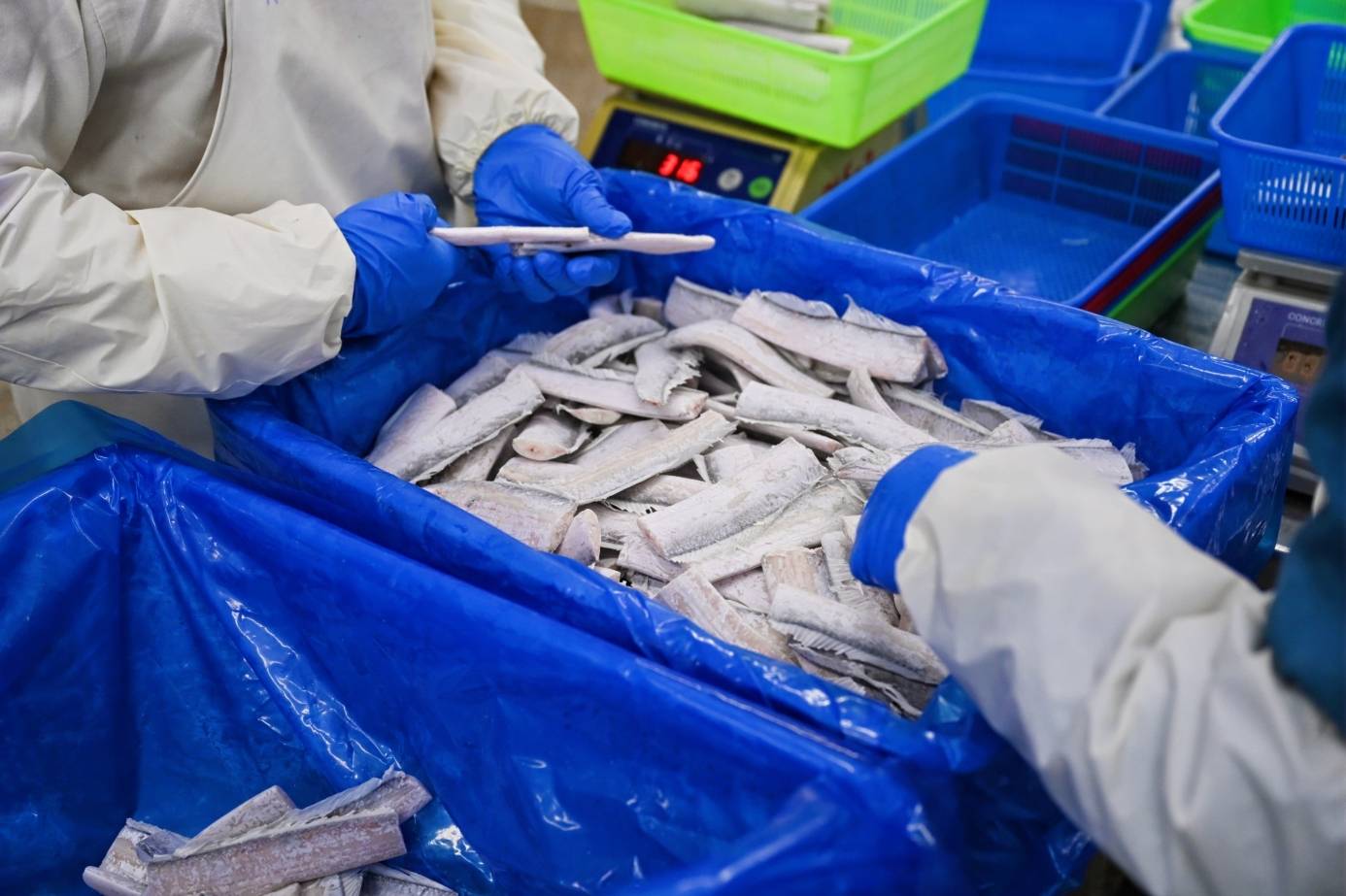 随后,团长一行随新鲜打捞上来的带鱼一同来到鲜到鲜得带鱼工厂,见证带鱼宰杀、分切、冷冻包装出厂全过程。其中,通过速冻设备,鲜到鲜得在短时间内将带鱼中心温度降至-18℃以下,实现快速冷冻,锁住食材的鲜美、营养与安全。