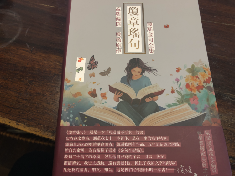 谢丽君最近在看《琼章瑶句》,这是一本琼瑶金句全集,由琼瑶原作,孟瑞编撰,目前还没有在大陆出版。孟瑞是一位马来西亚华裔读者,遍读琼瑶所有作品,五年之前与琼瑶结识于网络。琼瑶自己评价说:“这是一本可遇不可求的书。它内容之丰富,涵盖我七十一本著作,是我一生写作精华……”