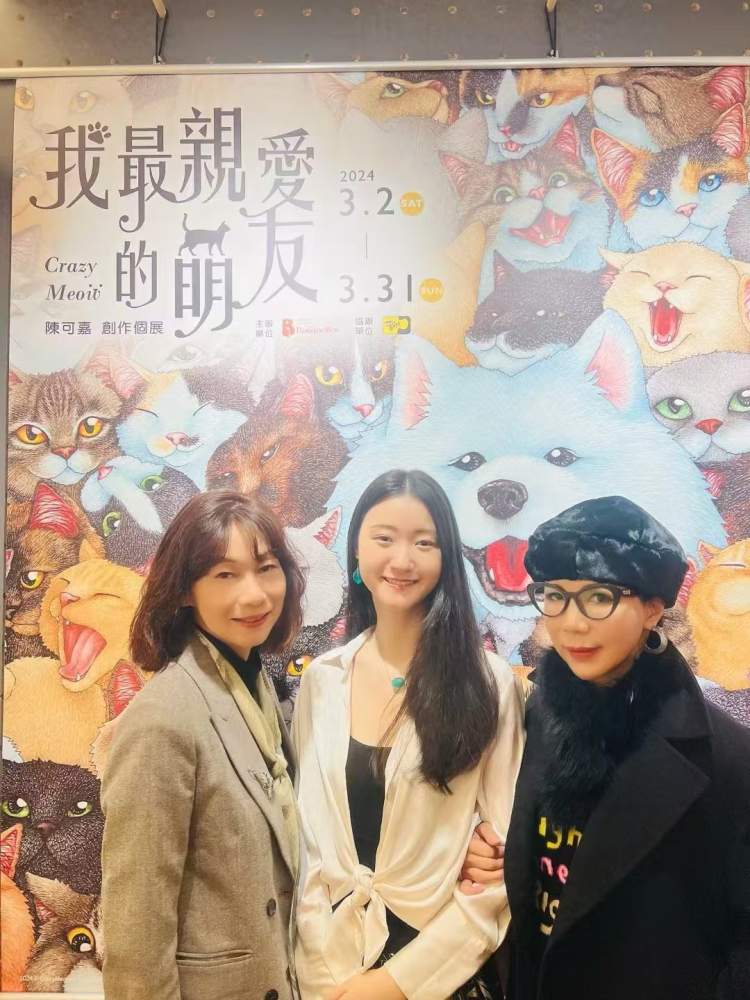 2024年3月,谢丽君(右1)与琼瑶媳妇何琇琼、琼瑶孙女陈可嘉在陈可嘉个人画展现场合影