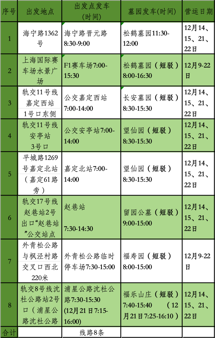 记者从市道运中心了解到,为方便市民冬至期间祭扫,从12月9日起,本市将开通8条冬至定点扫墓班车,其中7条与轨道交通接驳的扫墓班线实行免费乘坐,覆盖本市嘉定、青浦等六家公墓(具体线路营运安排附后)。为缓解冬至祭扫期间通行压力,地面公交将对途经祭扫场所和重点祭扫地区的公交线路增加车辆,加密班次,延长车辆运营时间,满足群众出行需求。详见↓