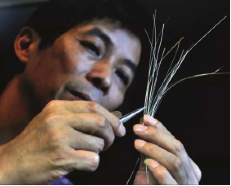 而金山麦秆画,则以其线条和拉毛为主的独创技艺而闻名,利用麦秆天然的纹理和光泽,通过熨烫、染色、选材用色、运刀切贴等复杂工序,追求刚柔相济的艺术效果。
