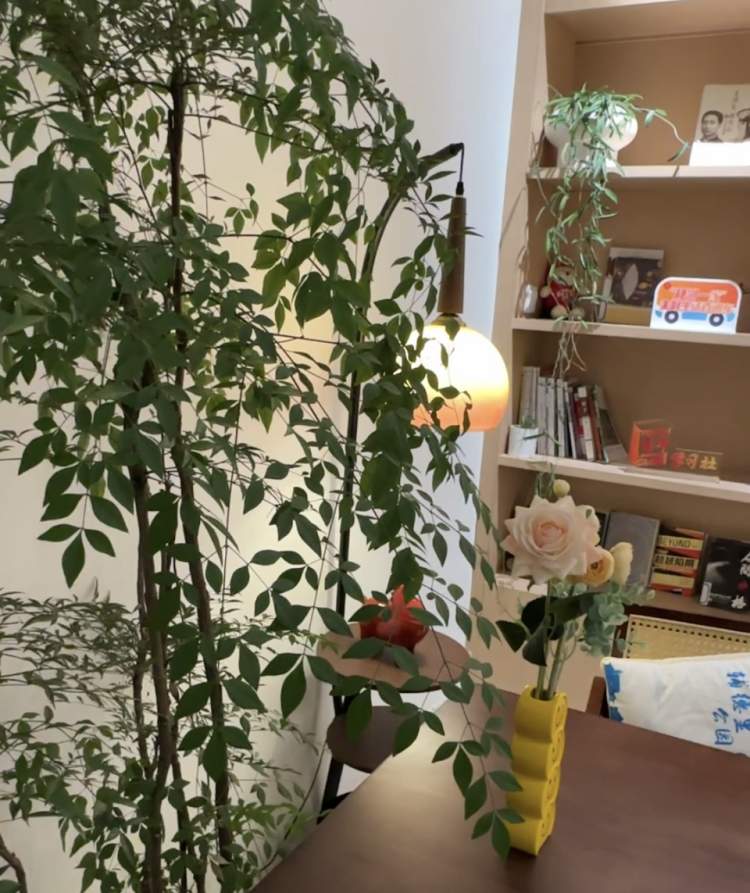 透过高大的龙血树,可以看到魔都版的“黄果树瀑布”正在作为热门打卡点,被众多游客驻足参观、拍照,瀑布的哗啦声和小鸟的叫声汇合在一起,传入店内,在这样富有层次而又愉悦的白噪音中,看书也格外有情调。