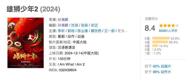 《雄狮少年》系列让人惊喜的是,续作质量仍然维持了稳定的高水准,从第一部阿娟在天台上迎着朝阳舞狮,最后舞狮比赛“大杀四方”惊艳众人,到第二部阿娟如“野草”般坚韧勇敢直面艰苦和黑幕,最终和小伙伴们合力拨开云雾见光明,片中草丛后雄狮猛然冲出伴随着花瓣四散的惊艳场景,正如一直坚持勇往直前的阿娟一样,深深戳中了观众的泪点。